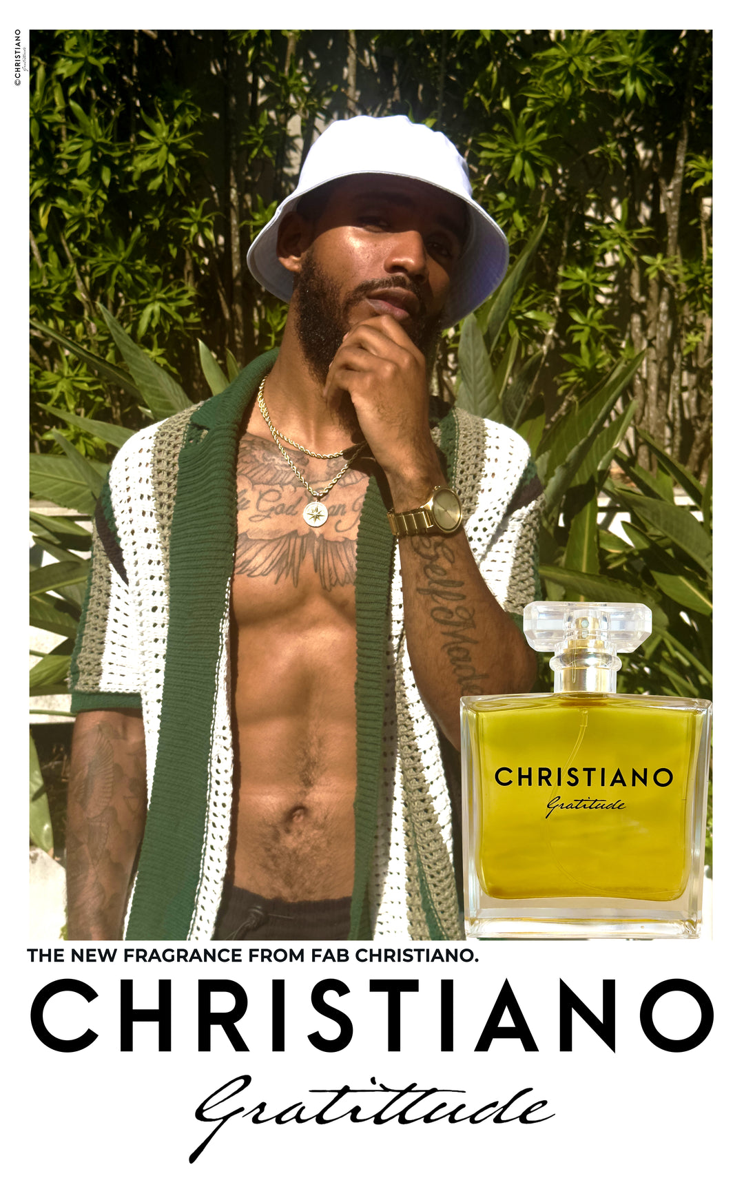 The name Christiano means Follower of Christ, a nod to the legacy FAB aims to leave behind, rooted in faith, purpose, and authenticity. His debut fragrance, Gratitude, was inspired by the belief that thankfulness is the key to abundance. “You attract blessings by counting the ones you already have,” he says.